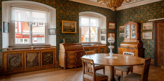 Der mit Aposteldarstellungen geschmückte Kachelofen (1732) stammt aus dem Haus der Familie Benz am Überlinger Graden Berg. Auch die mit Intarsien in Nussbaumholz verzierten Schränke, der Rollschreibtisch und Sekretär entstanden im 18. Jahrhundert.