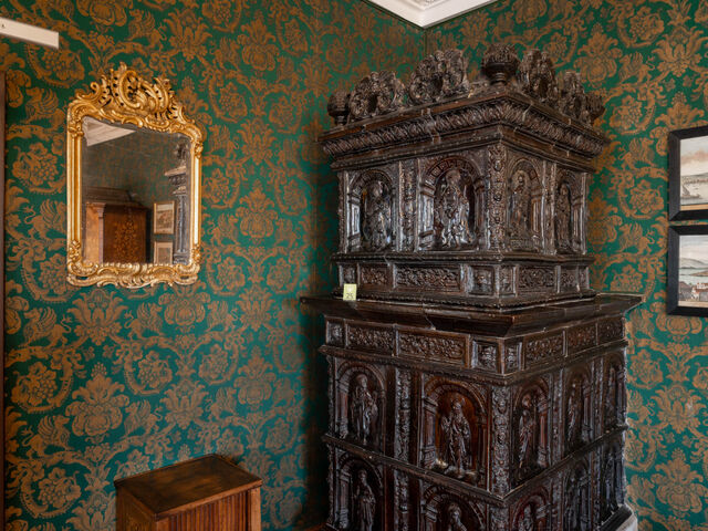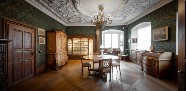Besondere Beachtung verdient darüber hinaus der prachtvolle Deckenstuck dieses Raums aus der Zeit kurz nach 1700.