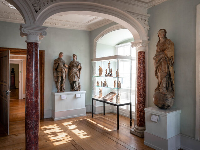 Eindrucksvoll zeugen die Skulpturen der Anna Selbdritt, des hl. Christophorus (beide 1750) und der Maria mit Kind (1746) vom Können des Bildhauers, Stuckateurs und Altarbauers Joseph Anton Feuchtmayer. Er schuf sie für die Luzien-Kapelle dieses Hauses. Anna Selbdritt und Christophorus standen dort auf den beiden erhaltenen Konsolen an den Längswänden hoch über den Gläubigen. Die heutige Präsentation hingegen erlaubt die Betrachtung der Meisterwerke aus unmittelbarer Nähe.