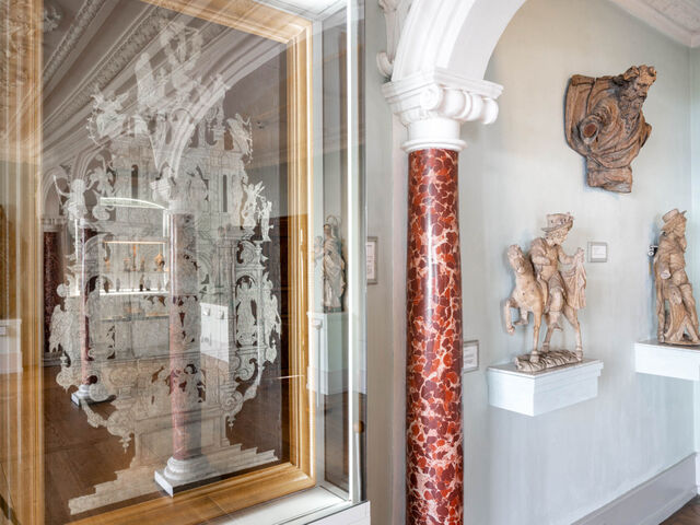 In den Vitrinen sind Kleinplastiken u. a. von Michael Zürn d. Ä., Joseph Anton Feuchtmayer und dessen Nachfolgern Johann Georg Dirr und Johann Georg Wieland ausgestellt. Es handelt sich um Entwürfe für großformatige Bildwerke wie auch um vollendete Darstellungen im kleinen Format.