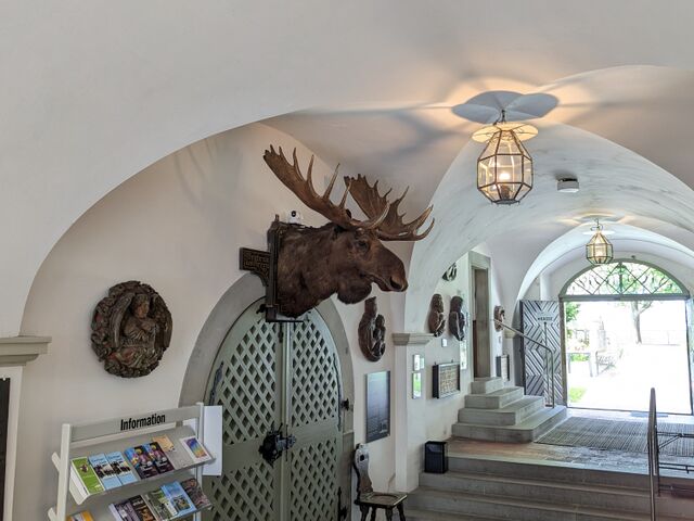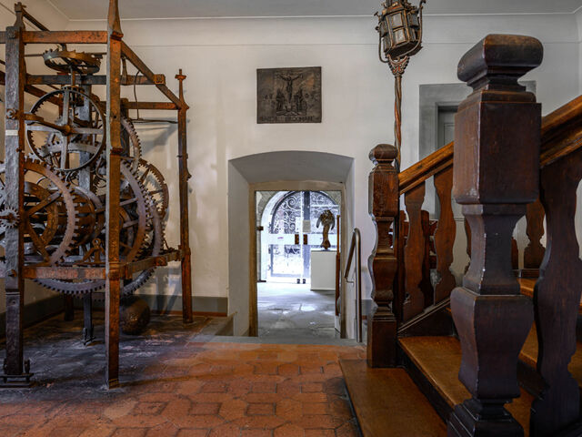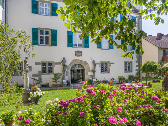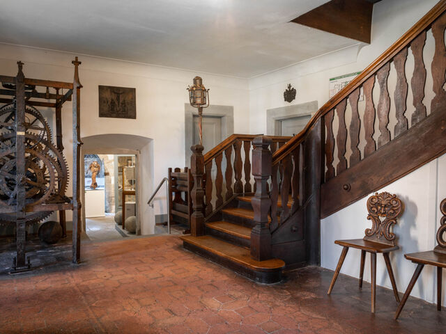 Im Zuge des Umbaus wurde der Haupteingang, der sich ursprünglich an der Westseite des Gebäudes befand, in seine Mitte verlegt und würdevoll geschmückt. Vor dem Umbau führte dieser Zugang in eine große, wohl als Lager- und Wirtschaftsraum dienende Erdgeschosshalle. In Fortsetzung des neuen Haupteingangs entstand durch das Einziehen von Wänden der lang gestreckte, repräsentative Empfangsraum mit Gewölbe. Im ersten Obergeschoss des Westflügels ließen die neuen Eigentümer anstelle der ursprünglichen Gesindestuben einen großzügigen Festsaal mit umlaufender Galerie errichten und ausstatten.