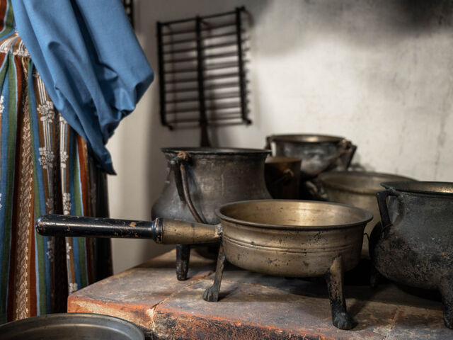 Ausgestellt sind sowohl alltägliche Gegenstände wie Zinngeschirr, Pfannenblöcke und Blasebalg für den offenen Herd als auch spezielle Maschinen zum Schneiden von Nudeln und Schälen von Kartoffeln sowie ein Satz Waffeleisen.