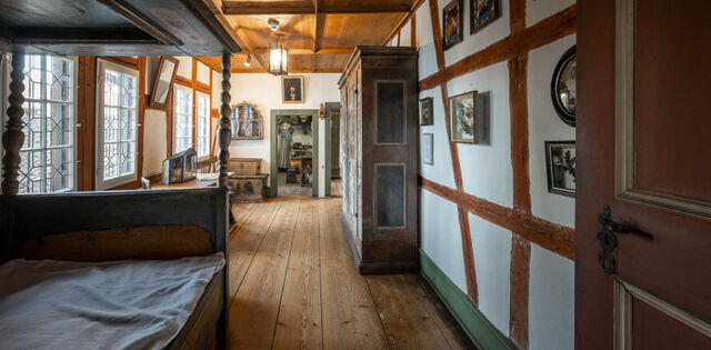 Den als Bauernschlafstube eingerichteten Raum beherrschen ein schwerer, mit Rosen bemalter Bauernschrank und ein Himmelbett, das ebenfalls mit Ornamenten geschmückt ist.