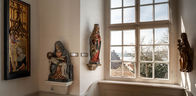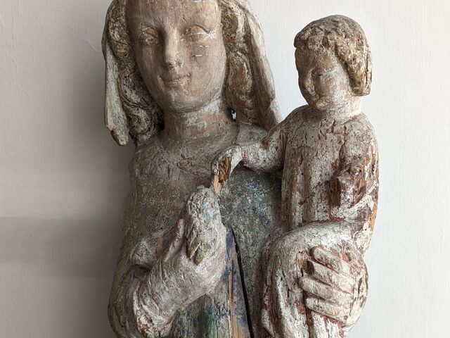 Der stark beschädigte Torso der Muttergottes mit Kind ist ein frühes Zeugnis kirchlichen Lebens im reichstädtischen Überlingen. Vielleicht von Meister Heinrich von Konstanz geschaffen, gehört sie zu den qualitätvollsten Holzschnitzereien am Bodensee kurz nach 1300.