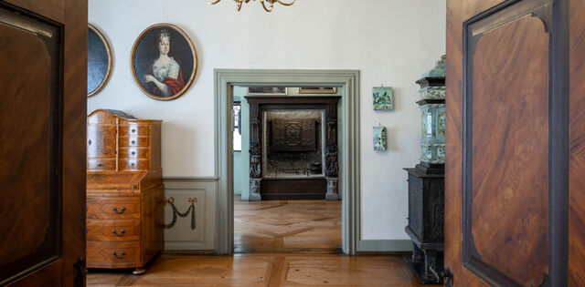 Kachelöfen, die es seit dem Mittelalter gibt, waren im 17. und 18. Jahrhundert die bevorzugte Heizung. Sie gewährleisteten andauernde Wärme und konnten, wie der Ofen dieses Raums, in einem Nebenzimmer versorgt werden. Der mit ländlichen Motiven bemalte Kachelofen wurde im schweizerischen Steckborn hergestellt. Steckborner Öfen waren aufgrund ihrer Qualität und Schönheit in der ganzen Bodenseeregion gefragt.