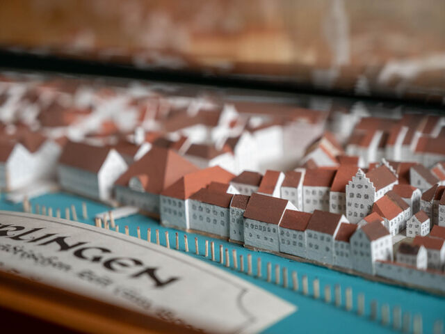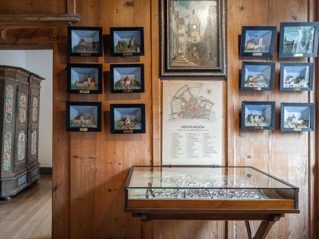 Die Objekte in den Vitrinen sind Zeugnisse der allgemeinen Geschichte, des Rechts- und Münzwesens sowie der Gebietsentwicklung der Reichsstadt Überlingen. Die Ölgemälde, Aquarelle und Stiche des 17. bis 19. Jahrhunderts zeigen die Stadt und wichtige geschichtliche Ereignisse.