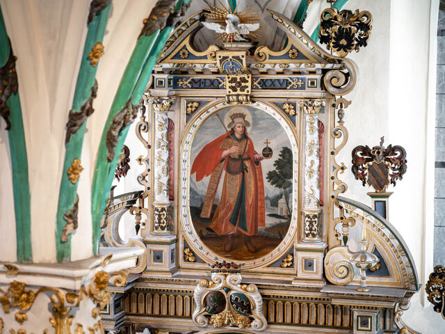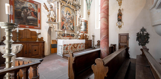 Das Altarblatt des 1626 gestifteten und datierten Hochaltars zeigt die Himmelfahrt Mariens, die Predella den Tod Mariens. Die seitlichen Skulpturen der hl. Andreas und Bartholomäus wurden 1695 hinzugefügt. Das Gemälde der oberen Zone stellt den hl. Luzius dar, den Patron des Bistums Chur, aus dem die Familie von Meldegg stammen soll. Die Familie Reichlin hat deren Wappen und deren Namen als Teil des eigenen Familiennamens übernommen.