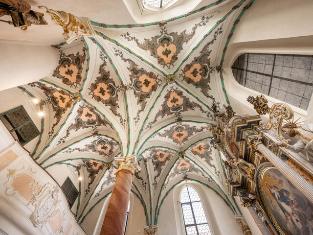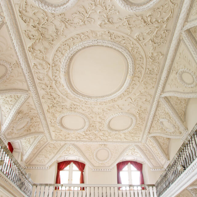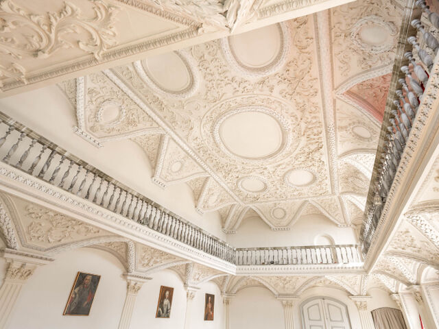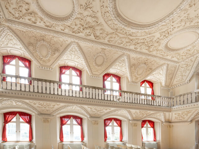 Um den zweigeschossigen Saal mit umlaufender Galerie schaffen zu können, ließ der Architekt Christian Thumb die in diesem Gebäudeflügel liegenden Gesindestuben des 15. Jahrhunderts entfernen.