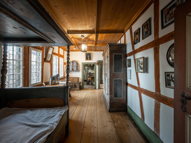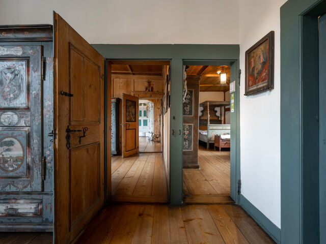 Den als Bauernschlafstube eingerichteten Raum beherrschen ein schwerer, mit Rosen bemalter Bauernschrank und ein Himmelbett, das ebenfalls mit Ornamenten geschmückt ist.